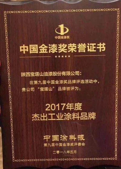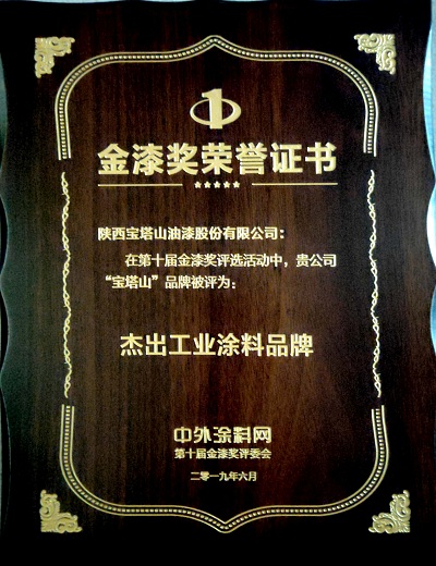 2019年6月,必一体育官方网站(中国)漆的“必一体育官方网站(中国)”品牌在中外涂料网第十届金漆奖评选活动中被评为“杰出工业涂料品牌”