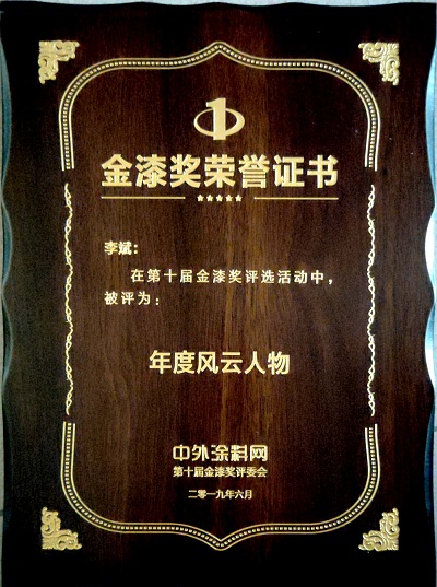 2019年6月,必一体育官方网站(中国)漆李斌同志在中外涂料网第十届金漆奖评选活动中被评为“年度风云人物”