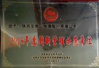 2018年3月,必一体育官方网站(中国)漆被陕西省企业信用协会与陕西省企业信用年度创新峰会组委会评为“2018年度创新管理示范单位”