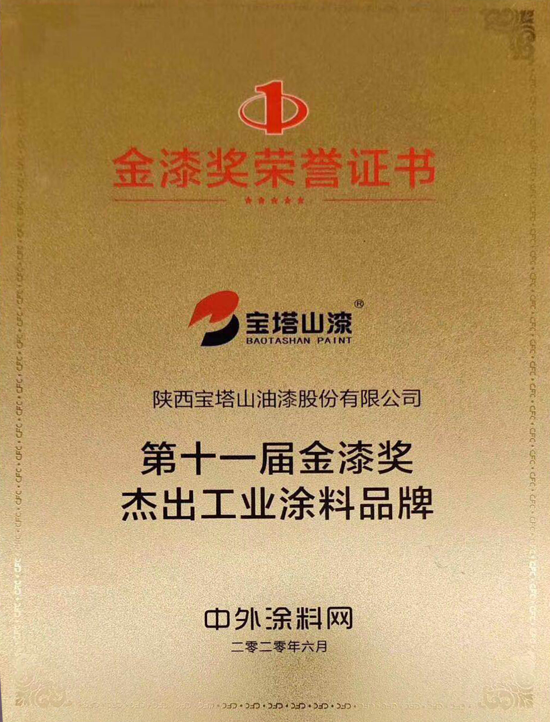2020年6月,必一体育官方网站(中国)漆荣获第十一届金漆奖“杰出工业涂料品牌”