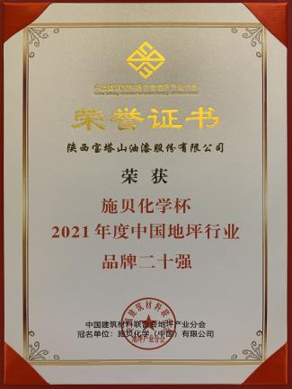 2022年3月,必一体育官方网站(中国)漆荣获“施贝化学杯2021年度中国地坪行业品牌二十强”。