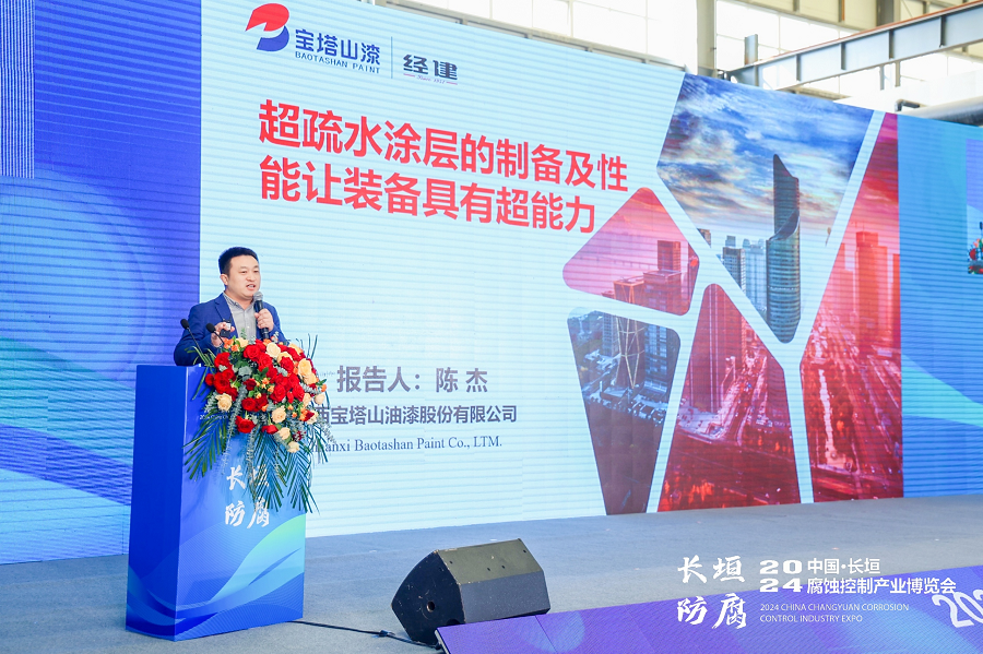 在同期举行的技术交流会上,必一体育官方网站(中国)漆技术总监陈杰分享了公司一项专利技术,他从超疏水涂层的原理出发,深入浅出地解析了这一前沿技术如何通过特殊结构设计,实现水滴在超疏水透明涂层材料表面具有大的接触角(>150°),小的滚动角(<10°),从而极大提升涂层的耐腐蚀和自清洁能力,不仅为装备穿上了一层“隐形盔甲”,更为推动相关行业向绿色、智能、可持续发展方向转型提供了强有力的技术支撑。